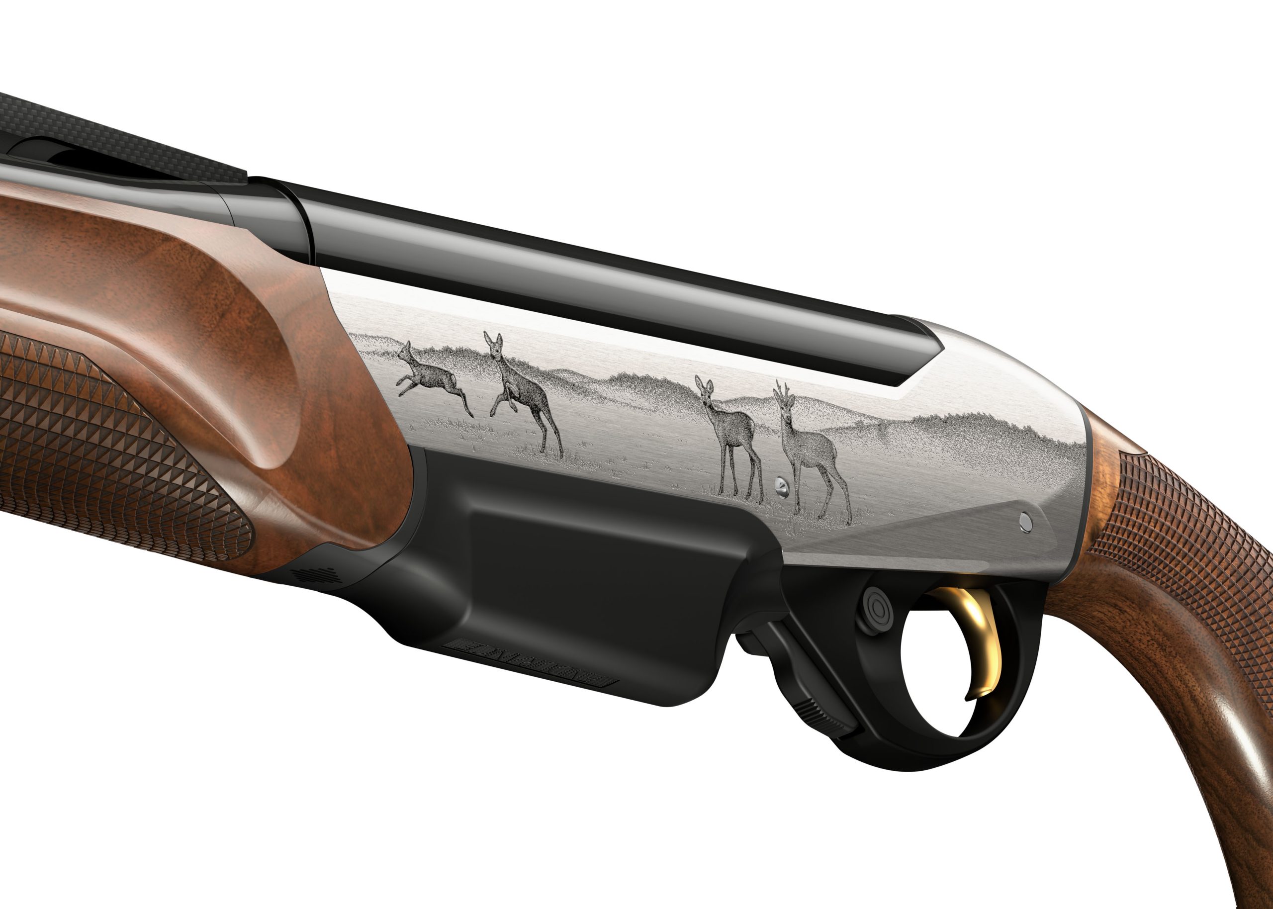Dal punto di vista estetico, la Endurance BE.S.T. De luxe vanta una carcassa in Ergal che si distingue per un lavoro di incisione laser che disegna due paesaggi differenti. Sul lato destro, si stagliano tre cinghiali che attraversano un suggestivo paesaggio collinare, mentre sul lato sinistro sono raffigurati alcuni caprioli. Il logo del prodotto risalta con maggiore intensità grazie all’oro, che ne accresce la visibilità. La carcassa è dotata anche di un fodero, in lega leggera con finitura nera lucida, che presenta una serie di fori filettati nella parte superiore, per consentire il montaggio di una slitta Picatinny per l’installazione di un punto rosso o di un cannocchiale da battuta.