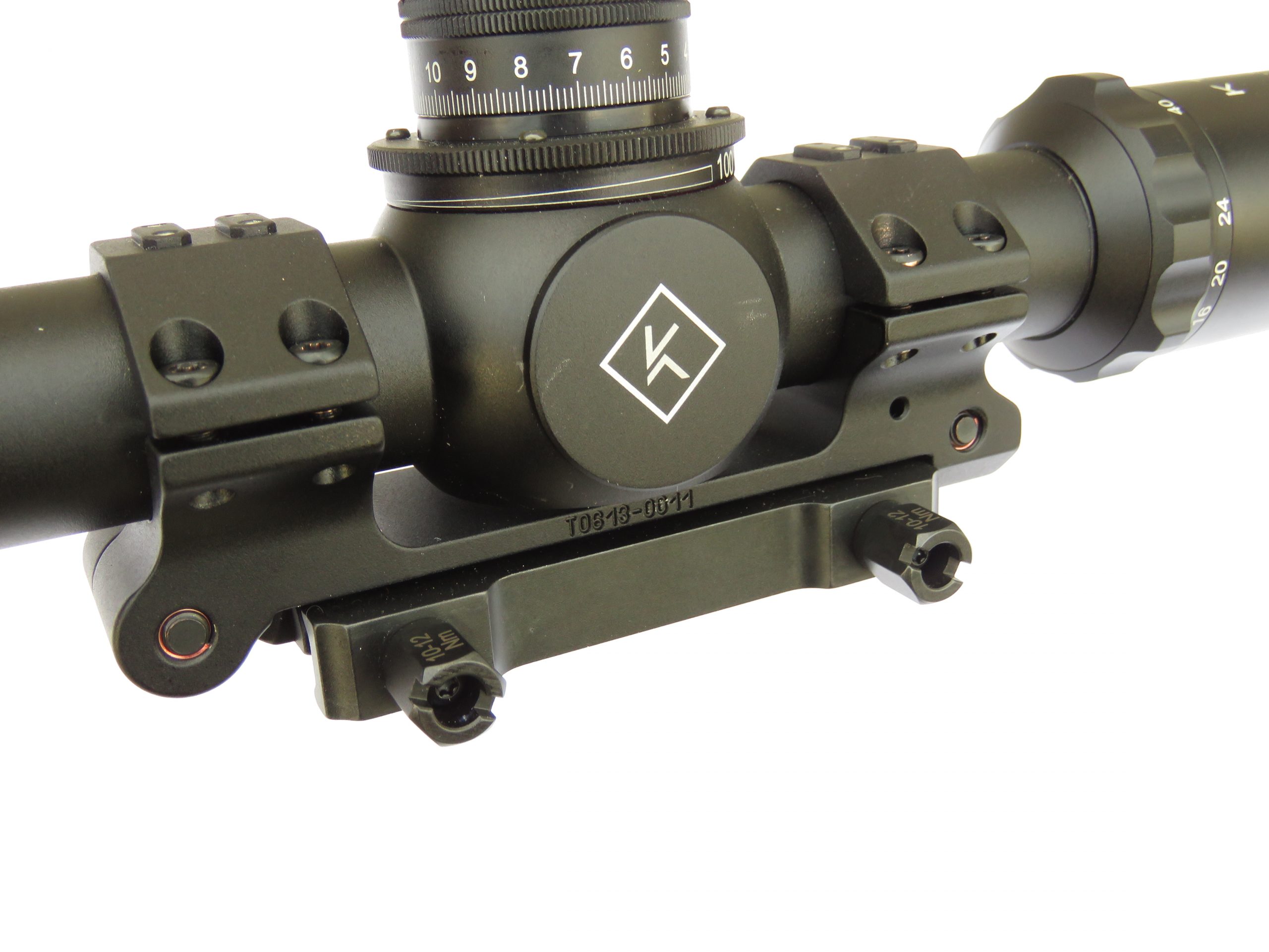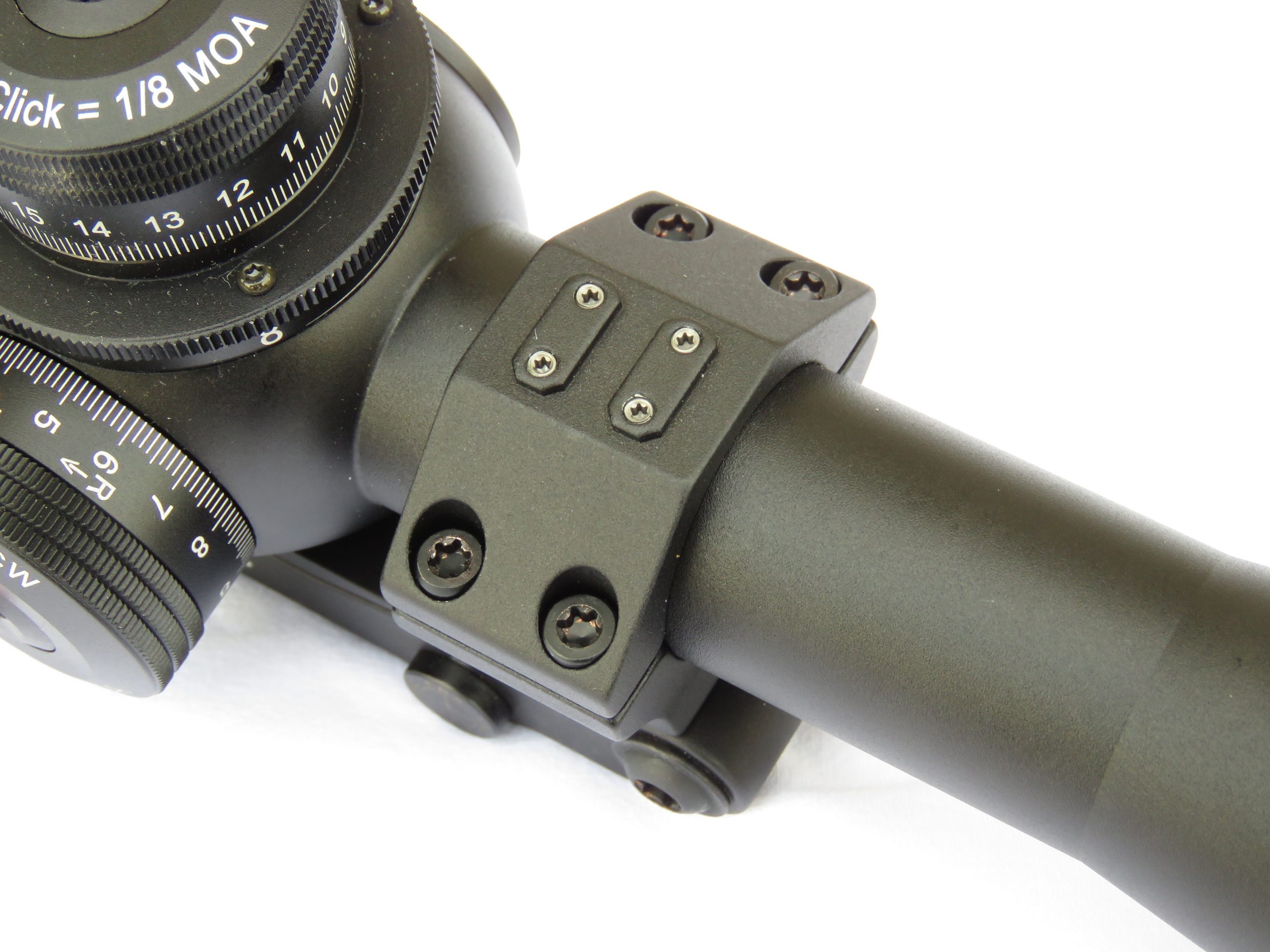 Per il fissaggio dell’ottica, l’attacco prevede due semianelli integrali, distanziati di 70 millimetri, sui quali si montano due semianelli superiori. Gli anelli hanno diametro di 30, 34 o addirittura 36 mm, e possono essere richiesti con altezze differenti: 20 o 25 mm per il diametro di 30 mm; 20, 25 e 30 mm per il diametro di 34 mm e 22 mm per il diametro di 36 mm. Al momento, il catalogo dell’importatore Erredi trading prevede l’altezza di 20 e 25 mm per l’anello di 30 mm e il 25 mm per l’anello di 34 mm. Ciascun semianello superiore si fissa all’inferiore per mezzo di due coppie di viti Torx e sulla sommità dei semianelli superiori sono presenti ulteriori interfacce per il montaggio di accessori come inclinometri, micro-Picatinny inclinate per micro dot secondari e così via.