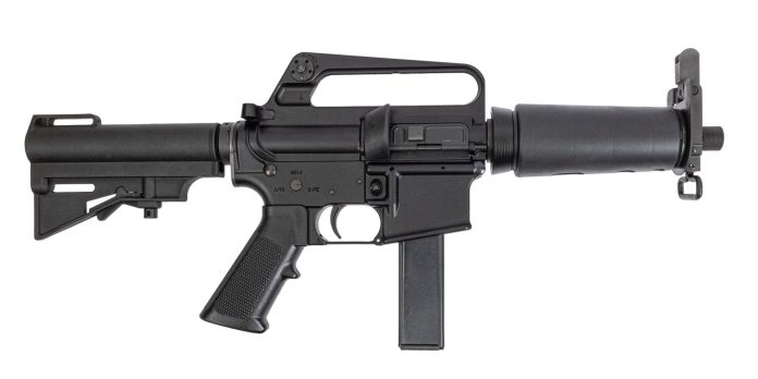 Come è noto, da qualche anno svariate aziende americane si dedicano alla riproduzione di esemplari della gamma Ar15 appartenenti alla primissima produzione o a contratti più o meno esotici. È la cosiddetta operazione “retro”. La più recente aggiunta a questa gamma è a marchio H&R e riproduce in versione solo semiauto la cosiddetta versione “Doe” della pistola mitragliatrice Colt calibro 9 mm, dove l’acronimo rappresenta il Dipartimento statunitense per l’energia. In particolare, questo allestimento ultracompatto era dato in dotazione al personale di guardia alle centrali nucleari. L’arma deriva dalla piattaforma Ar15, dimensionalmente strutturata per gestire il calibro 9×19 con caricatori bifilari dritti. La canna della replica è lunga 7,5 pollici (erano 7 nell’originale Colt), replicato alla perfezione sia il manicotto astina polimerico, sia l’hand stop anteriore che evitava pericolosi scivolamenti in avanti della mano, verso e oltre la volata. L’arma era dotata anche di un mirino abbattibile, altrettanto lo è la replica, la mira posteriore è la classica diottra a L sul maniglione fisso. Data la classificazione statunitense come Sbr, è stato necessario modificare il calciolo collassabile tipo Car15, realizzando una variante meno sviluppata in altezza che è stata qualificata come arm brace.