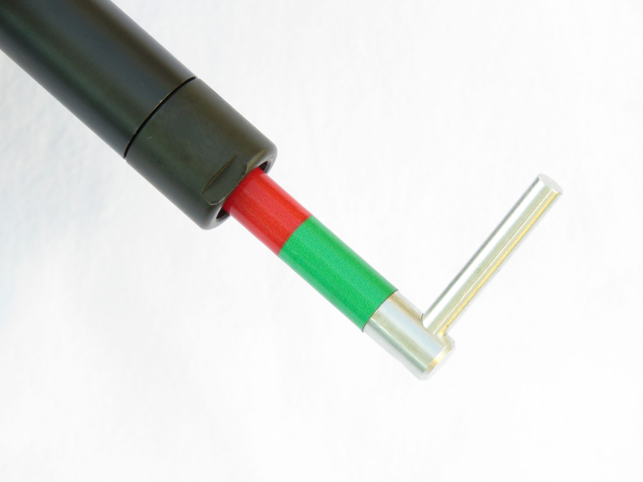 Stick vuol dire banalmente bastoncino e il dispositivo è costituito, appunto, da un’astina in alluminio, all’estremità anteriore della quale è innestato un braccetto perpendicolare che ne consente la manovra con le dita. Poco più avanti dell’innesto del braccetto, c’è una fascetta colorata in rosso e in verde, mentre a circa metà lunghezza c’è una scanalatura tornita, sulla quale si investe un piccolo o-ring in gomma. Infine, all’estremità opposta rispetto al braccetto di manovra, c’è una testina in polimero fissata all’asta mediante una filettatura.