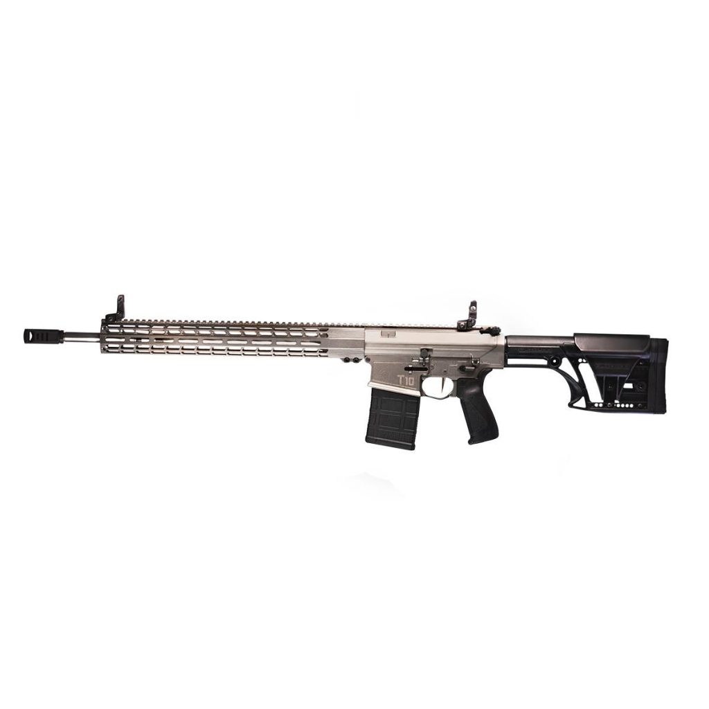 La versione T10 Lp (sotto) ha più prettamente il ruolo di marksman, è capace di solo fuoco semiauto anche nella versione M/Le, canna lunga 20 pollici con freno di bocca, astina sempre in lega leggera con slot M-lok, calcio fisso regolabile in lunghezza e nell’altezza dell’appoggiaguancia tipo Mba.