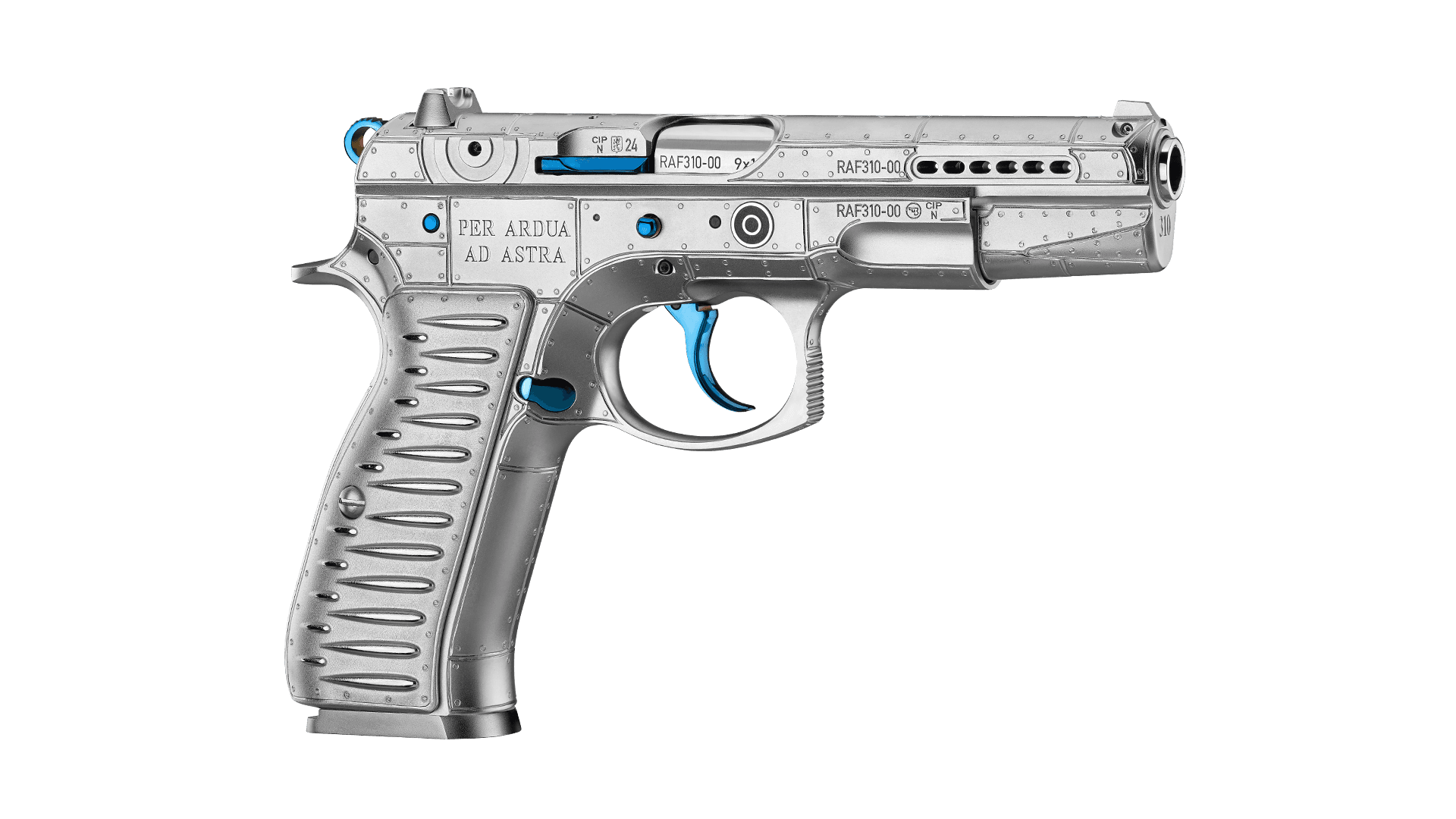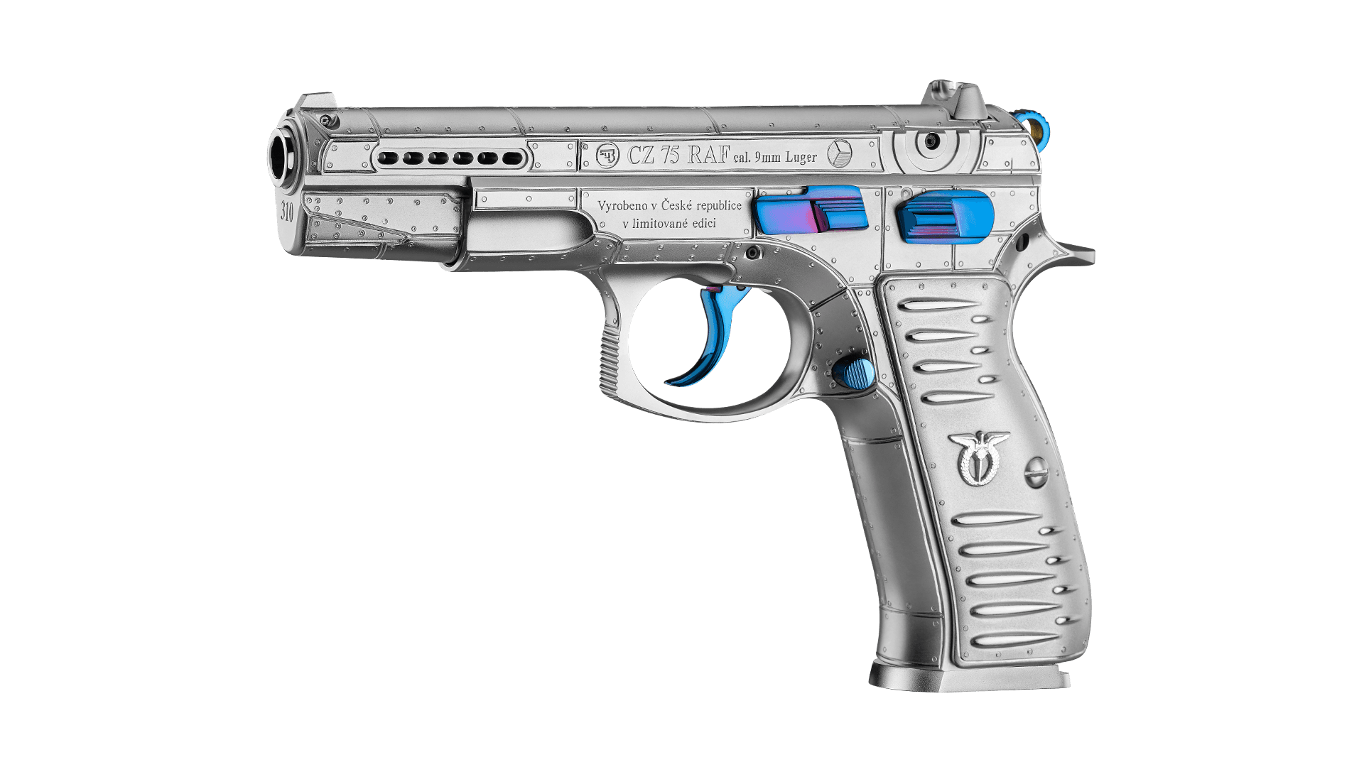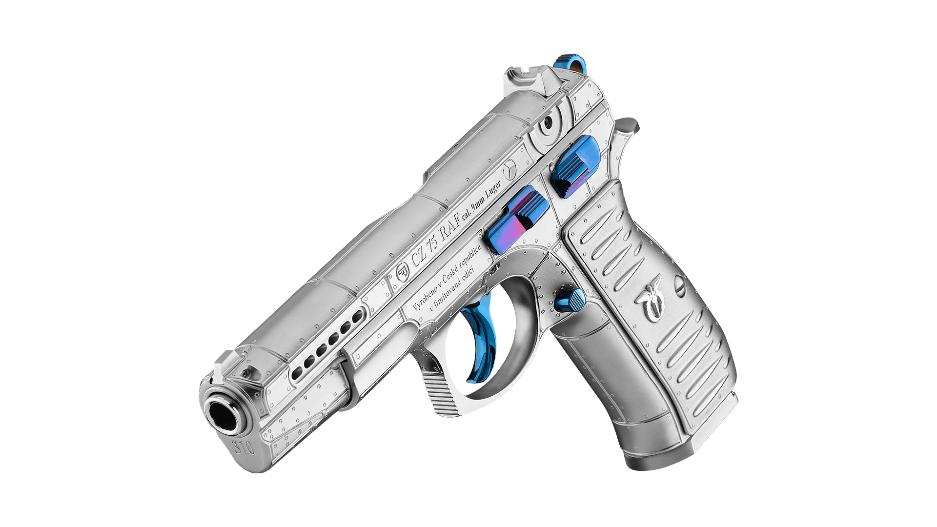 Le fresature di presa sul carrello sono sostituite da un motivo a cerchi concentrici che ricorda lo stemma britannico sulle ali e sulla fusoliera degli Spitfire, ma è presente anche lo stemma circolare ripartito in tre che rappresentava l’insegna nazionale cecoslovacca sugli aerei manovrati dai piloti del Paese. Cane, grilletto e comandi sono bruniti blu elettrico, sul lato destro del castello è presente il motto Raf “Per ardua ad astra” (raggiungere le stelle attraverso le avversità), sotto la volata è inciso il numero di squadrone aereo mentre il fondello del caricatore ospita lo stemma della Raf. La matricolazione è speciale, con prefisso “Raf” e numero di serie che riprende il numero degli squadroni cecoslovacchi in seno all’aviazione britannica, sono in tutto 14 come gli esemplari realizzati di questa speciale pistola.