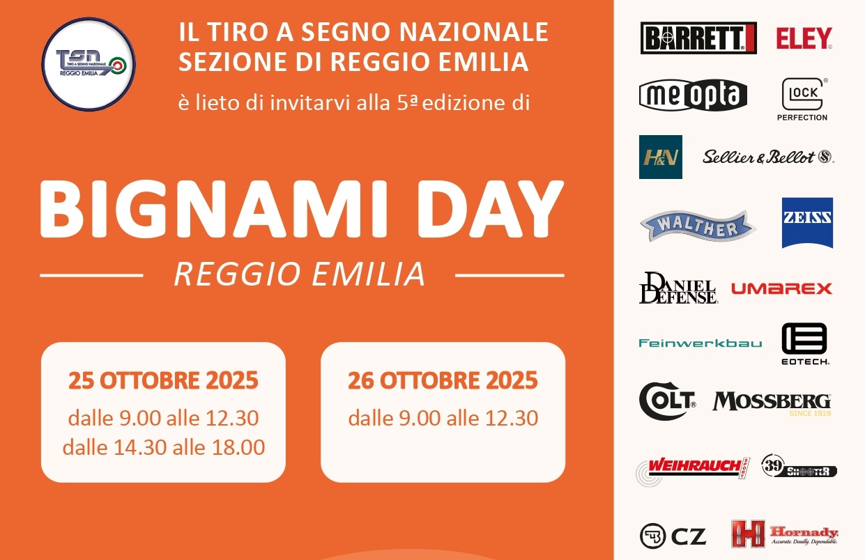 Il 25 e 26 ottobre prossimi, il Tiro a segno nazionale di Reggio Emilia ospiterà la quinta edizione del Bignami day, kermesse organizzata in collaborazione con il noto distributore altoatesino, nel corso della quale sarà possibile testare a fuoco alla distanza di 25 metri i più interessanti e recenti modelli di armi corte e Pcc, nonché visionare e toccare con mano le carabine di grosso calibro. Nel poligonetto a 10 metri, sarà possibile testare anche pistole e carabine Walther e Feinwerkbau, marchi di cui Bignami cura la distribuzione in Italia.