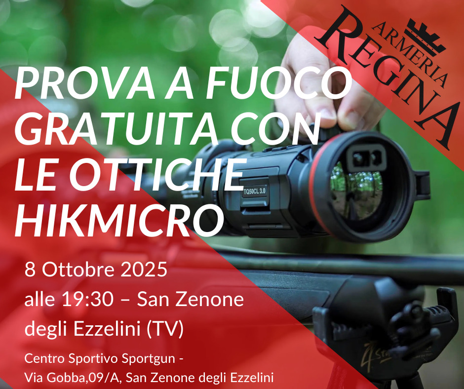 L’Armeria Regina invita cacciatori e appassionati alla prova a fuoco gratuita delle ottiche notturne Hikmicro, al Centro sportivo Sportgun di San Zenone degli Ezzelini (Tv). La prova si svolgerà mercoledì 8 ottobre 2025 a partire dalle 19,30. Il centro sportivo Sportgun si trova in via Gobba 9/A a San Zenone degli Ezzelini (Tv).